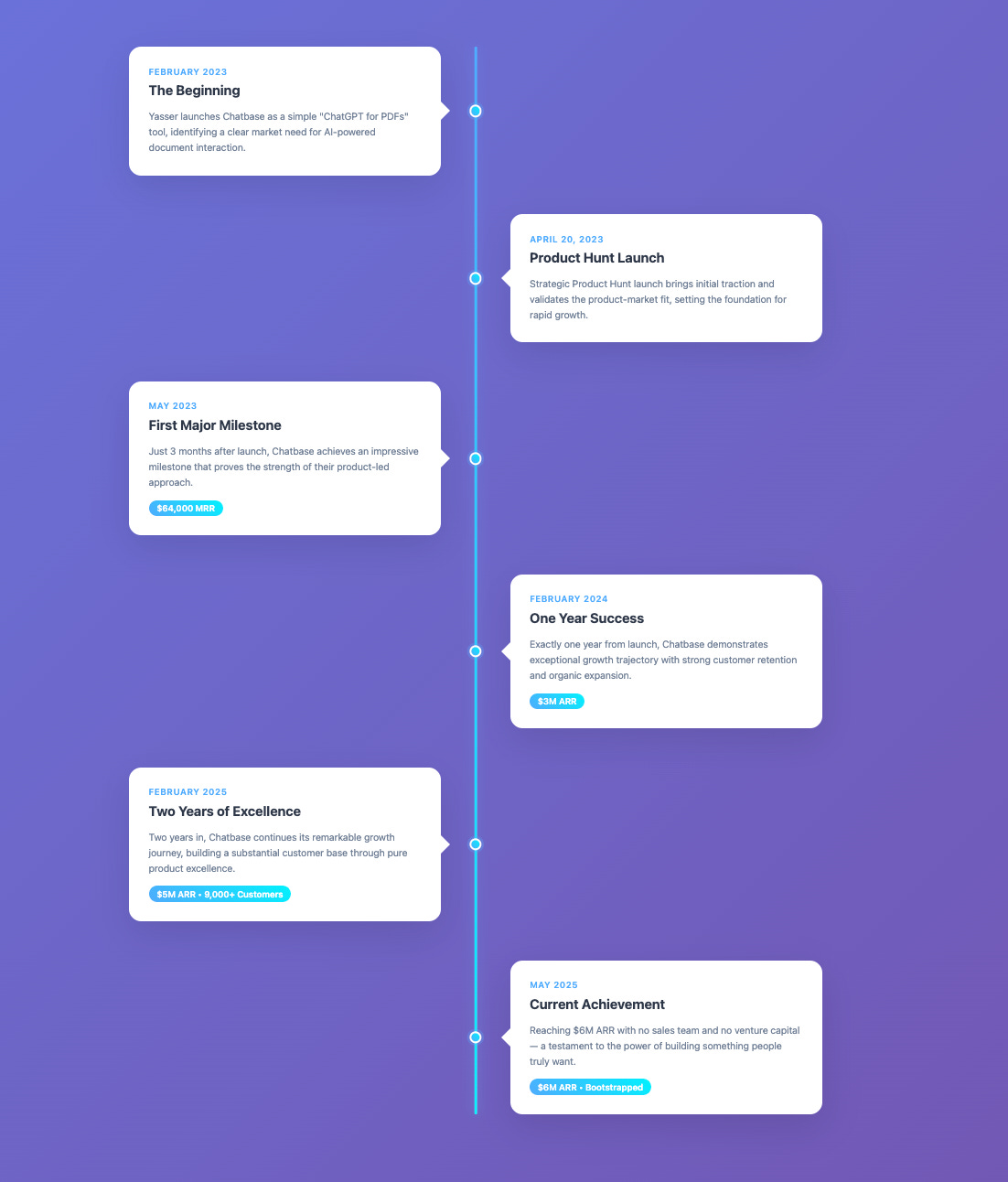 First-mover advantage. Being the first "chat with PDF" SaaS tool gave them a massive head start. While others were still figuring out what to build, Chatbase was already serving customers.