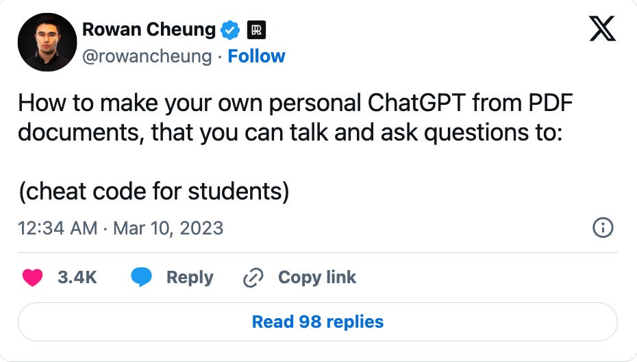 Why did it blow up? Perfect timing. This was right when everyone was talking about ChatGPT, but most people had no idea how to actually use AI for their business. Chatbase made it stupid simple. Plus, being the first "chat with PDF" tool meant zero competition.