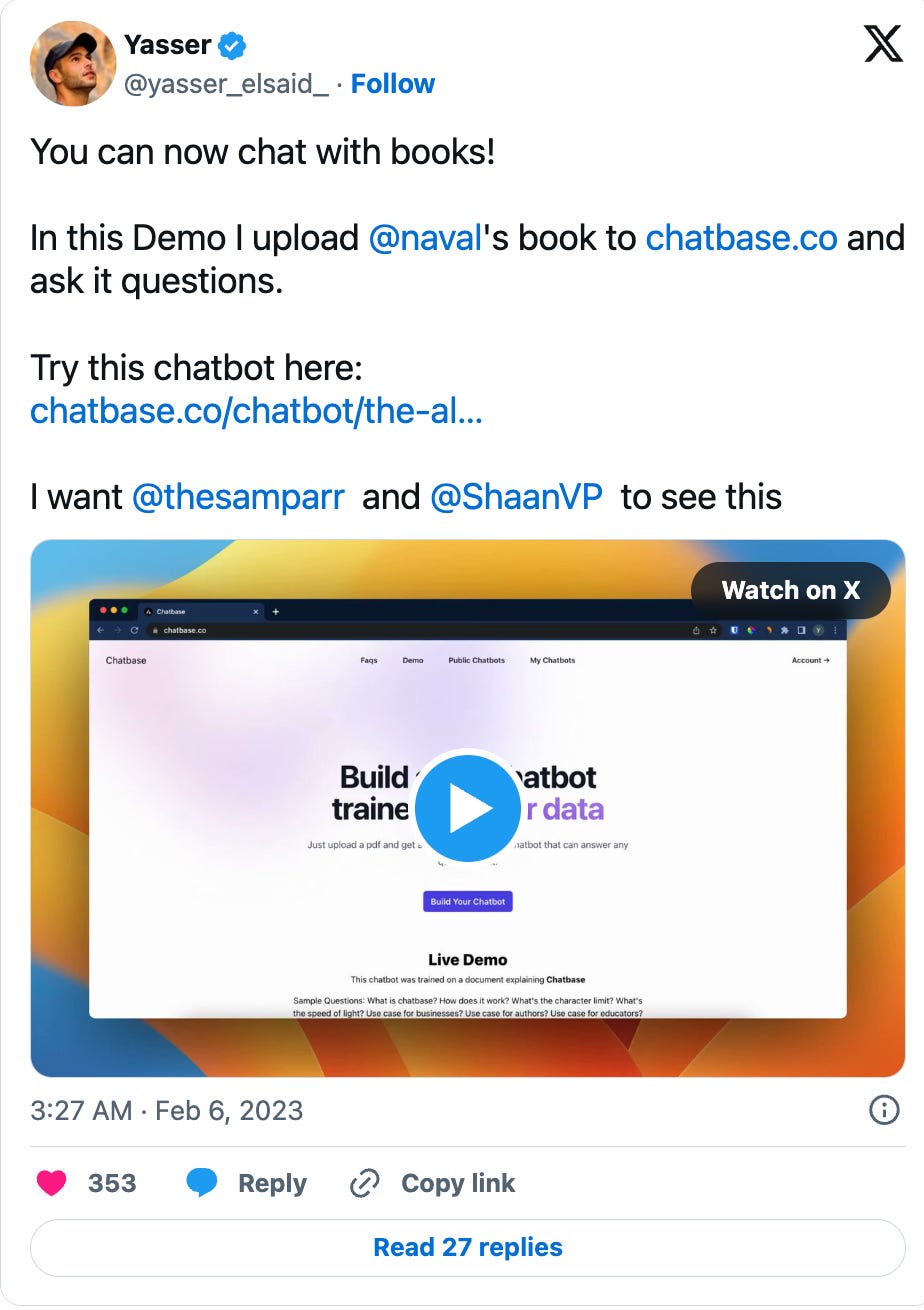 On February 4th, 2023, Yasser launched Chatbase to his whopping 16 Twitter followers. This was literally his third tweet ever. He had no audience, no marketing budget, no fancy launch strategy.